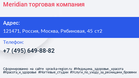 Meridian, торговая компания по адресу 121471, Россия, Москва, Рябиновая, 45 ст2 в дальнейшем Организация, размещена в следующих категориях: