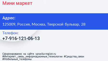 Мини-маркет по адресу 125009, Россия, Москва, Тверской бульвар, 28 в дальнейшем Организация, размещена в следующих категориях:
