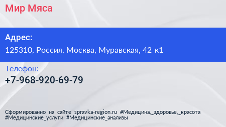 Мир Мяса по адресу 125310, Россия, Москва, Муравская, 42 к1 в дальнейшем Организация, размещена в следующих категориях:
