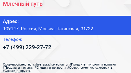 Млечный путь по адресу 109147, Россия, Москва, Таганская, 31/22 в дальнейшем Организация, размещена в следующих категориях: