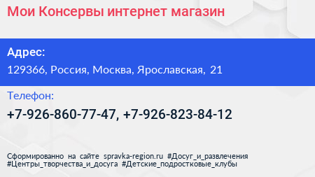 Мои Консервы, интернет-магазин по адресу 129366, Россия, Москва, Ярославская, 21 в дальнейшем Организация, размещена в следующих категориях: