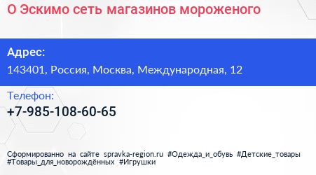 О! Эскимо, сеть магазинов мороженого по адресу 143401, Россия, Москва, Международная, 12 в дальнейшем Организация, размещена в следующих категориях: