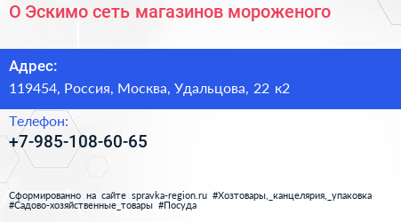 О! Эскимо, сеть магазинов мороженого по адресу 119454, Россия, Москва, Удальцова, 22 к2 в дальнейшем Организация, размещена в следующих категориях: