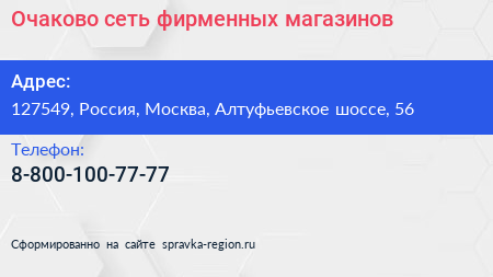Очаково, сеть фирменных магазинов по адресу 127549, Россия, Москва, Алтуфьевское шоссе, 56 в дальнейшем Организация, размещена в следующих категориях: