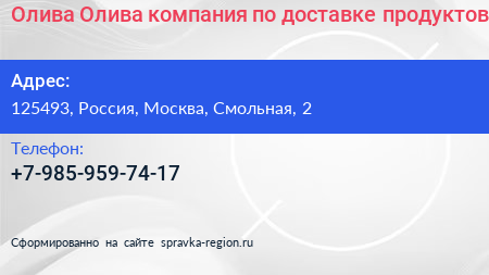 Олива Олива, компания по доставке продуктов по адресу 125493, Россия, Москва, Смольная, 2 в дальнейшем Организация, размещена в следующих категориях: