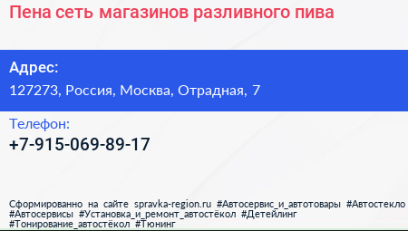 Пена, сеть магазинов разливного пива по адресу 127273, Россия, Москва, Отрадная, 7 в дальнейшем Организация, размещена в следующих категориях: