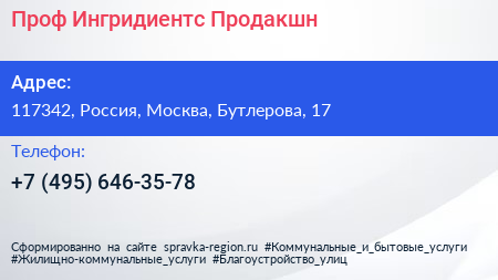 Проф-Ингридиентс Продакшн по адресу 117342, Россия, Москва, Бутлерова, 17 в дальнейшем Организация, размещена в следующих категориях: