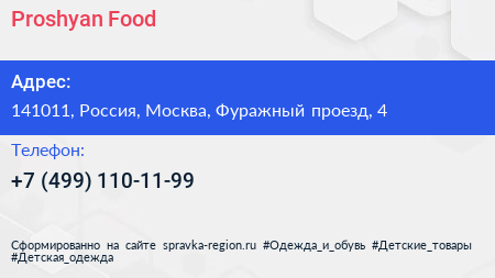 Proshyan Food по адресу 141011, Россия, Москва, Фуражный проезд, 4 в дальнейшем Организация, размещена в следующих категориях: