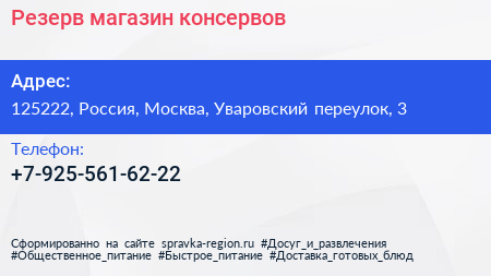 Резерв, магазин консервов по адресу 125222, Россия, Москва, Уваровский переулок, 3 в дальнейшем Организация, размещена в следующих категориях: