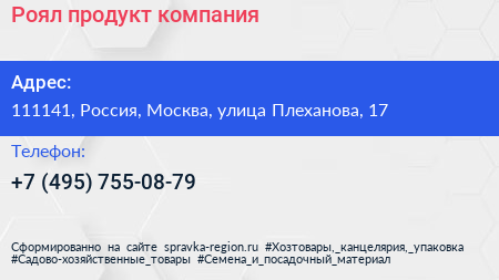 Роял продукт, компания по адресу 111141, Россия, Москва, улица Плеханова, 17 в дальнейшем Организация, размещена в следующих категориях: