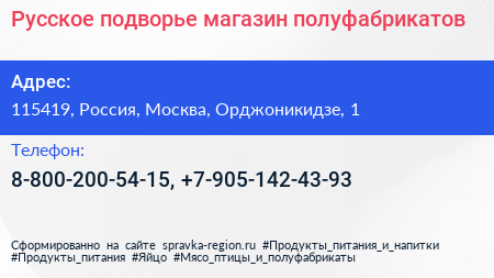 Русское подворье, магазин полуфабрикатов по адресу 115419, Россия, Москва, Орджоникидзе, 1 в дальнейшем Организация, размещена в следующих категориях: