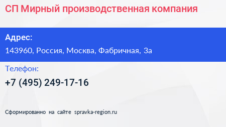 СП Мирный, производственная компания по адресу 143960, Россия, Москва, Фабричная, 3а в дальнейшем Организация, размещена в следующих категориях: