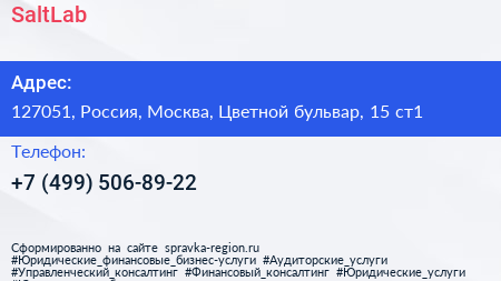 SaltLab по адресу 127051, Россия, Москва, Цветной бульвар, 15 ст1 в дальнейшем Организация, размещена в следующих категориях: