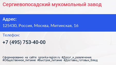 Сергиевопосадский мукомольный завод по адресу 125430, Россия, Москва, Митинская, 16 в дальнейшем Организация, размещена в следующих категориях: