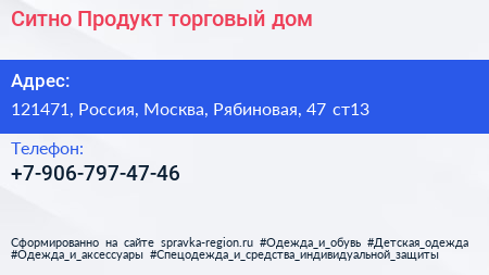 Ситно-Продукт, торговый дом по адресу 121471, Россия, Москва, Рябиновая, 47 ст13 в дальнейшем Организация, размещена в следующих категориях: