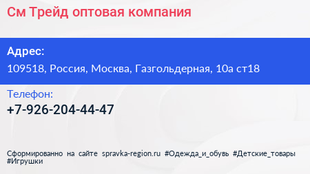См-Трейд, оптовая компания по адресу 109518, Россия, Москва, Газгольдерная, 10а ст18 в дальнейшем Организация, размещена в следующих категориях: