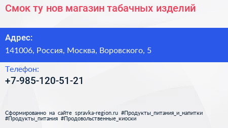Смок ту нов, магазин табачных изделий по адресу 141006, Россия, Москва, Воровского, 5 в дальнейшем Организация, размещена в следующих категориях: