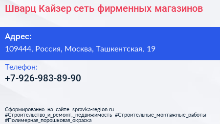 Шварц Кайзер, сеть фирменных магазинов по адресу 109444, Россия, Москва, Ташкентская, 19 в дальнейшем Организация, размещена в следующих категориях: