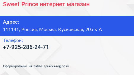 Sweet Prince, интернет-магазин по адресу 111141, Россия, Москва, Кусковская, 20а к А в дальнейшем Организация, размещена в следующих категориях: