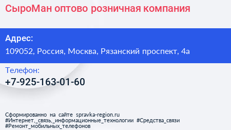 СыроМан, оптово-розничная компания по адресу 109052, Россия, Москва, Рязанский проспект, 4а в дальнейшем Организация, размещена в следующих категориях: