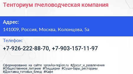 Тенториум, пчеловодческая компания по адресу 141009, Россия, Москва, Колонцова, 5а в дальнейшем Организация, размещена в следующих категориях: