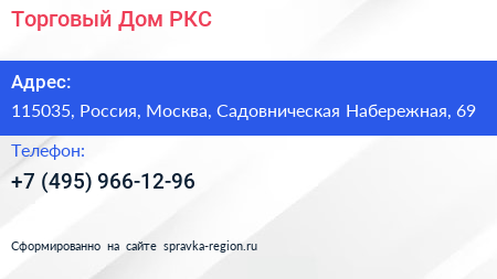 Торговый Дом РКС по адресу 115035, Россия, Москва, Садовническая Набережная, 69 в дальнейшем Организация, размещена в следующих категориях: