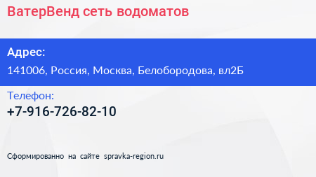 ВатерВенд, сеть водоматов по адресу 141006, Россия, Москва, Белобородова, вл2Б в дальнейшем Организация, размещена в следующих категориях: