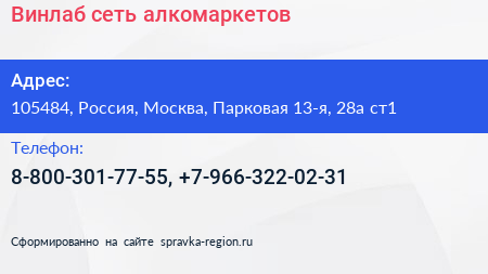 Винлаб, сеть алкомаркетов по адресу 105484, Россия, Москва, Парковая 13-я, 28а ст1 в дальнейшем Организация, размещена в следующих категориях: