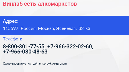 Винлаб, сеть алкомаркетов по адресу 115597, Россия, Москва, Ясеневая, 32 к3 в дальнейшем Организация, размещена в следующих категориях: