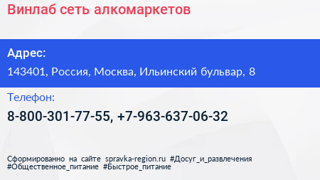 Винлаб, сеть алкомаркетов по адресу 143401, Россия, Москва, Ильинский бульвар, 8 в дальнейшем Организация, размещена в следующих категориях: