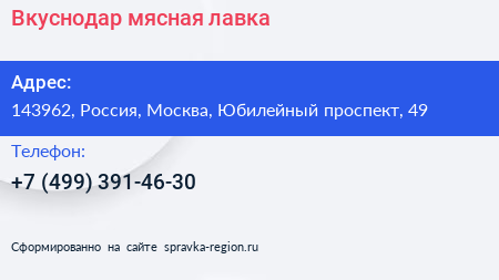 Вкуснодар, мясная лавка по адресу 143962, Россия, Москва, Юбилейный проспект, 49 в дальнейшем Организация, размещена в следующих категориях: