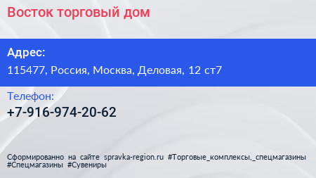 Восток, торговый дом по адресу 115477, Россия, Москва, Деловая, 12 ст7 в дальнейшем Организация, размещена в следующих категориях: