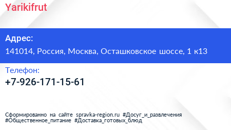 Yarikifrut по адресу 141014, Россия, Москва, Осташковское шоссе, 1 к13 в дальнейшем Организация, размещена в следующих категориях: