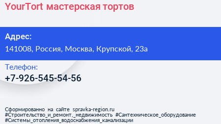 YourTort, мастерская тортов по адресу 141008, Россия, Москва, Крупской, 23а в дальнейшем Организация, размещена в следующих категориях: