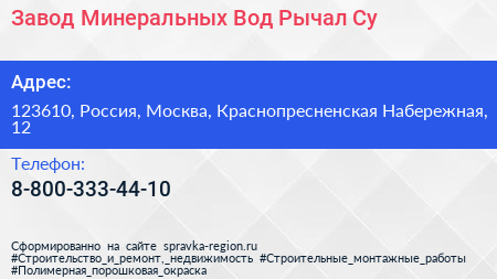 Завод Минеральных Вод Рычал-Су по адресу 123610, Россия, Москва, Краснопресненская Набережная, 12 в дальнейшем Организация, размещена в следующих категориях: