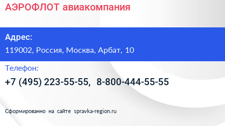 АЭРОФЛОТ, авиакомпания по адресу 119002, Россия, Москва, Арбат, 10 в дальнейшем Организация, размещена в следующих категориях: