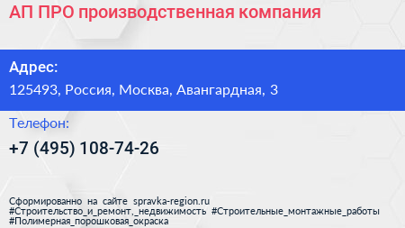 АП-ПРО, производственная компания по адресу 125493, Россия, Москва, Авангардная, 3 в дальнейшем Организация, размещена в следующих категориях: