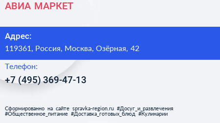 АВИА-МАРКЕТ по адресу 119361, Россия, Москва, Озёрная, 42 в дальнейшем Организация, размещена в следующих категориях: