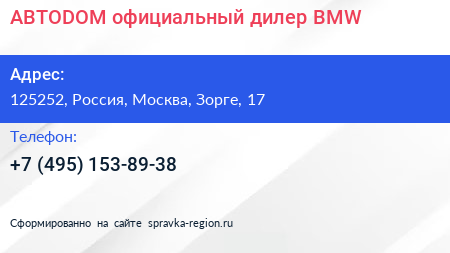 АВТОDОМ, официальный дилер BMW по адресу 125252, Россия, Москва, Зорге, 17 в дальнейшем Организация, размещена в следующих категориях: