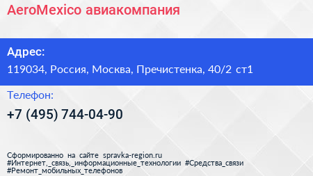 AeroMexico, авиакомпания по адресу 119034, Россия, Москва, Пречистенка, 40/2 ст1 в дальнейшем Организация, размещена в следующих категориях: