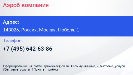 Аэроб, компания по адресу 143026, Россия, Москва, Нобеля, 1 в дальнейшем Организация, размещена в следующих категориях: