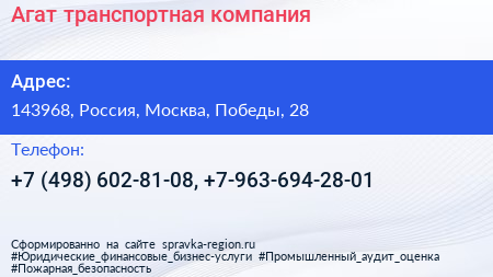 Агат, транспортная компания по адресу 143968, Россия, Москва, Победы, 28 в дальнейшем Организация, размещена в следующих категориях: