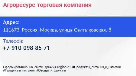 Агроресурс, торговая компания по адресу 111673, Россия, Москва, улица Салтыковская, 8 в дальнейшем Организация, размещена в следующих категориях:
