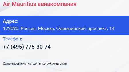 Air Mauritius, авиакомпания по адресу 129090, Россия, Москва, Олимпийский проспект, 14 в дальнейшем Организация, размещена в следующих категориях: