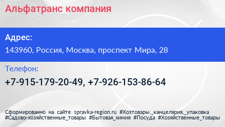 Альфатранс, компания по адресу 143960, Россия, Москва, проспект Мира, 28 в дальнейшем Организация, размещена в следующих категориях: