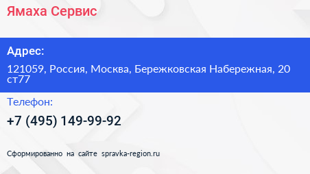 Ямаха-Сервис по адресу 121059, Россия, Москва, Бережковская Набережная, 20 ст77 в дальнейшем Организация, размещена в следующих категориях: