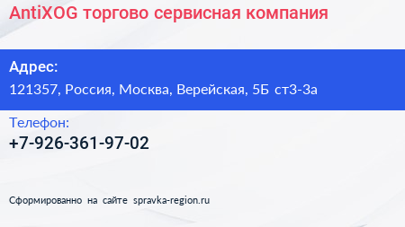 AntiХOG, торгово-сервисная компания по адресу 121357, Россия, Москва, Верейская, 5Б ст3-3а в дальнейшем Организация, размещена в следующих категориях: