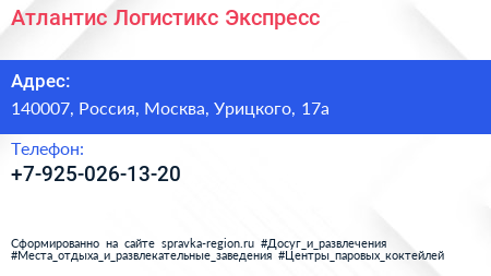 Атлантис Логистикс Экспресс по адресу 140007, Россия, Москва, Урицкого, 17а в дальнейшем Организация, размещена в следующих категориях: