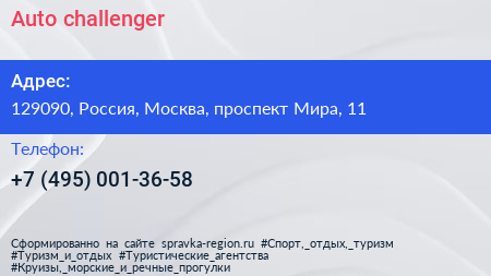 Auto-challenger по адресу 129090, Россия, Москва, проспект Мира, 11 в дальнейшем Организация, размещена в следующих категориях: