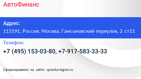 АвтоФинанс по адресу 115191, Россия, Москва, Гамсоновский переулок, 2 ст11 в дальнейшем Организация, размещена в следующих категориях:
